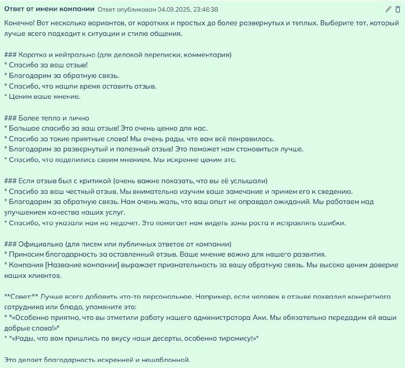 ИИ отвечает на отзывы Активно внедряем автоответы с ИИ, на одном из проектов, случайно включили автоответы с промтом "Ответь на отзыв", что получилось смотрите на скрине. Все ответы быстро почистили руками и теперь внедряем их постепенно. Cоздаем шаблон на оценку 5 и тестируем вручную, далее оставляем автоответы на пару дней,проверяем и только потом оценка 4.. Был приятно удивлен, что ИИ отлично понимает контекст отзыва, обращается по имени и отмечает детали + переводит текст отзыва на 46 языков. #dailygrownews