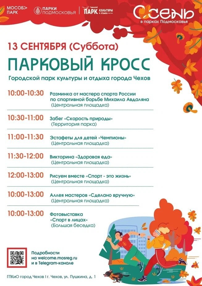 ✨ Фестиваль 🏅 ПАРКОВЫЙ КРОСС 🔴10:00-10:30 Разминка от мастера спорта России по спортивной борьбе Михаила Авдаляна (Центральная площадка) 🔵10:30-11:00 Массовый забег «Скорость природы» (Территория парка) 🟣11:00-11:30 Эстафеты для детей «Чемпионы» (Центральная площадка) 🟡11:30-13:00 Викторина «Здоровая еда», Рисуем вместе «Спорт - это жизнь» (Центральная площадка) 🚫 Возраст: 0+ 📆 13.09.2025 🏢 Городской парк культуры и отдыха 📍 г. Чехов, ул. Пушкина, д.1 🪙 Вход свободный❗️ ⭐Поддержать канал голосом ✅ Мероприятия Чехов https://dzen.ru/id/66cc4b48e9ef144699238a51 http://vk.com/chekhov_events http://dzen.ru/chekhov_events