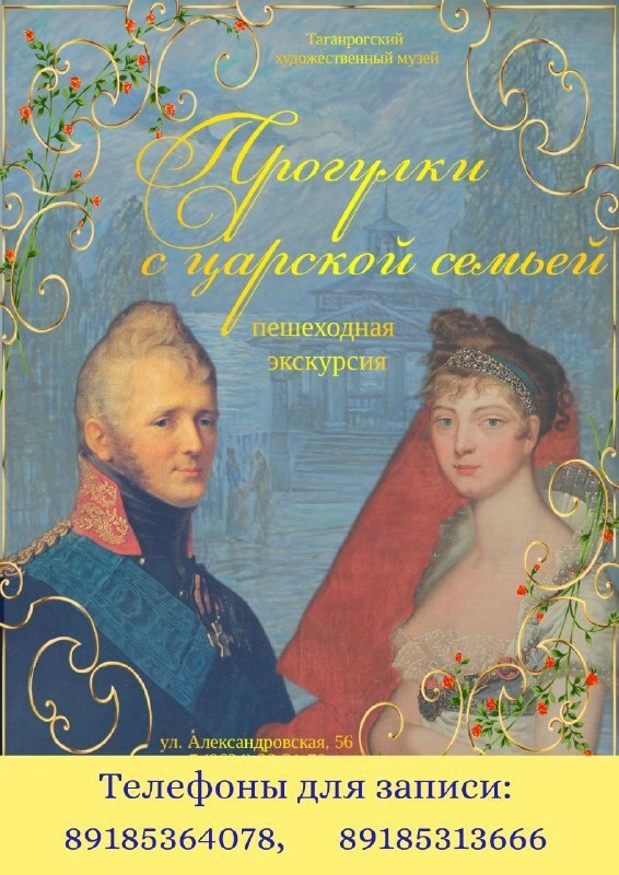 В этом году исполняется 200 лет со дня приезда Александра I в Таганрог. В честь этого знакового события 16 сентября в 10:00 мы приглашаем вас на уникальную пешеходную экскурсию "Прогулки с царской семьей". Император Александр Первый, вошедший в историю как Благословенный, в последний раз посетил Таганрог в 1825 году. Эта трагическая история сразу же обросла мифами и легендами, превратившись в одно из самых мистических событий первой половины 19 века. Пешеходная экскурсия «Прогулки с царской семьёй» познакомит с любимым маршрутом венценосной четы в Таганроге. Старт экскурсии: Александровская, 56. Запись по телефону: 89185364078, 89185313666