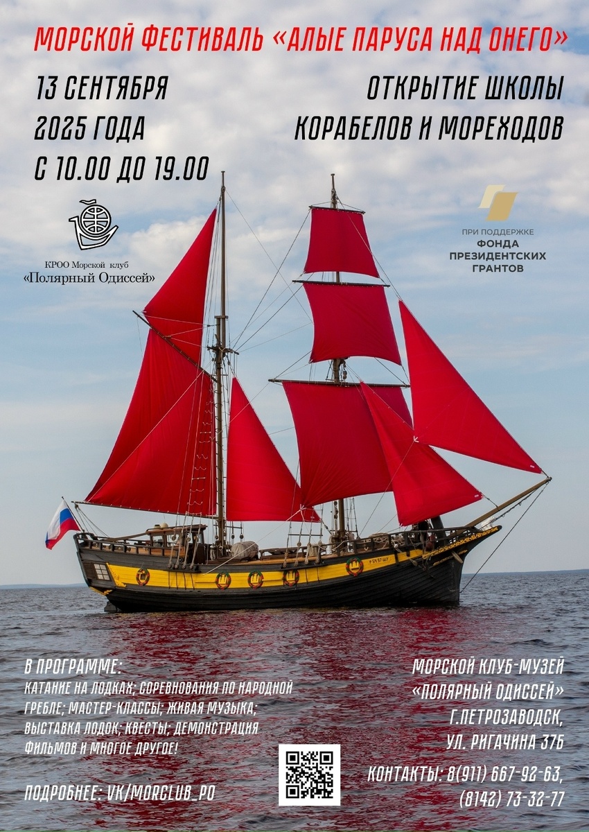 Министерство экономического развития Карелии приглашает на фестиваль «Алые паруса над Онего»(18+), который стартует 13 сентября при поддержке Фонда президентских грантов. Торжественное открытие состоится в 11:00 на территории музея «Полярный Одиссей» в Петрозаводске. С 11:30 гостей ждет насыщенная программа: освящение киля коча «Помор» с закладкой частицы дуба Мамврийского, выступления творческих коллективов, интерактивная программа ансамбля «Кижи» в 12:30 и выступление фокусника для детей в 13:00. С 12:00 до 18:00 можно будет кататься на лодках и ладье «Рюрик», а также заключить меморандум на бригантине под алыми парусами. С 11:00 до 14:00 пройдут молодецкие забавы «Русский двор». В течение всего дня бесплатно работают выставочные павильоны, проходят мастер-классы и конкурсы.