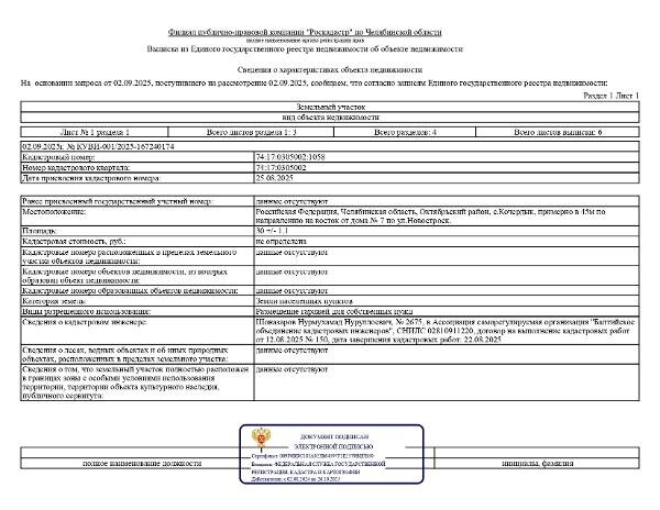 Название: земельный участок из земель населённых пунктов Кочердыкского сельского поселения с кадастровым номером 74:17:0305002:1058