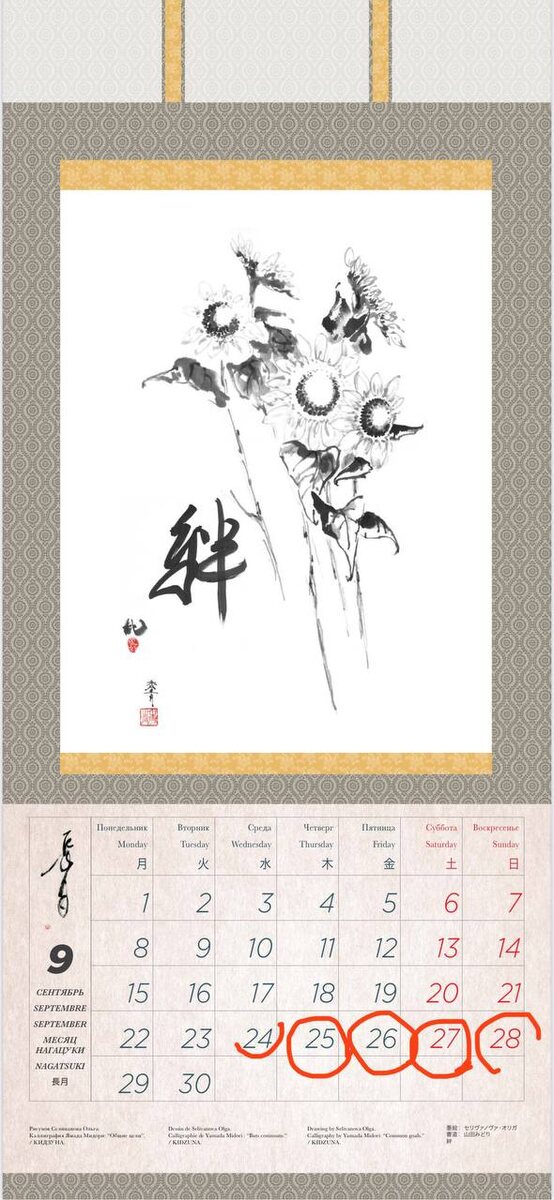 На странице календаря отмечено время работы выставки проекта Нихон но Би - Японская красота. Всего несколько дней. Это обусловлено коротким сроком жизни растений в композициях икэбана. Пожалуйста, при планировании визита сверяйтесь с часами работы музея на официальном сайте. Мы с радостью ответим на Ваши вопросы по каждому экспонату! В зале будут участники выставки, преподаватели различных японских искусств. На этой странице: Рисунок Селиванова Ольга. Каллиграфия Ямада Мидори: “Общие цели”. / КИДЗУНА.
