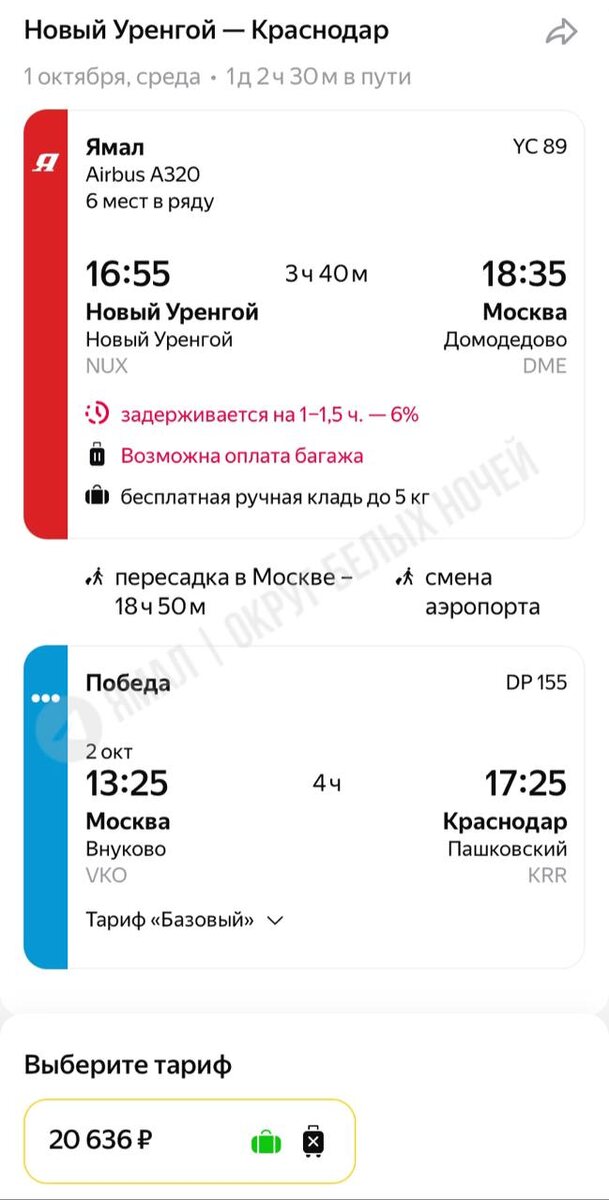 Появились рейсы из Нового Уренгоя в Краснодар — улететь можно за 20 тысяч рублей Аэропорт южного города был закрыт с 2022 года, а со вчерашнего дня он возобновил работу. На сервисе покупки билетов появились рейсы из Нура: например, 1 октября с большой пересадкой в Москве. Также в сентябре обещают добавить прямые рейсы из Екатеринбурга. Начинаем планировать поездку на Черное море 🥂 Подписаться | Прислать новость | Дать «буст»