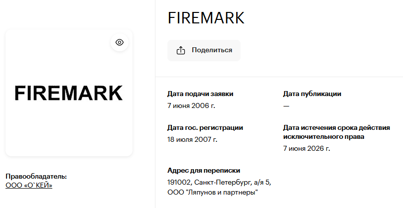 Firemark это – торговая марка. Она была зарегистрирована на территории РФ в далёком 2007 году и вот уже почти два десятилетия принадлежит торговой сети компании ООО «О`КЕЙ».