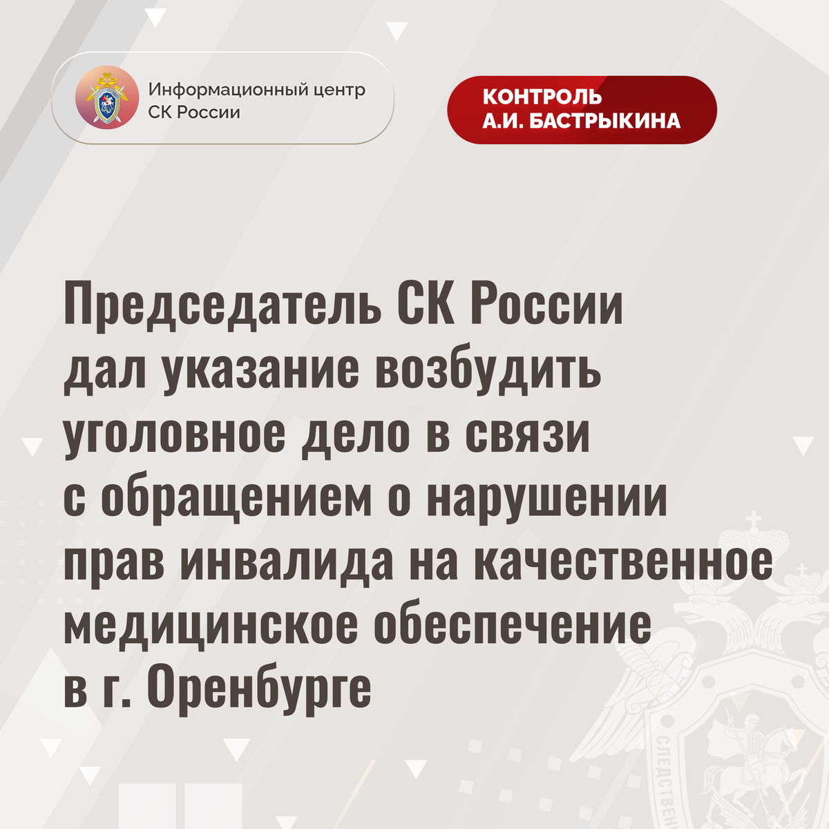 Председатель СК России дал указание возбудить уголовное дело в связи с обращением о нарушении прав инвалида на качественное медицинское обеспечение в г. Оренбурге