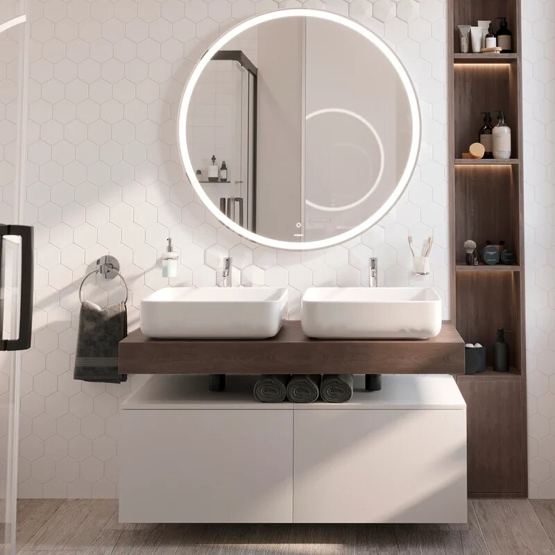 Круг – форма, которую дизайнеры считают универсальной. Она подходит практически к любому стилю, будь то минимализм, скандинавский интерьер или классика. Круглое зеркало создаёт мягкие линии, визуально уравновешивает пространство и делает его более гармоничным. Особенно выигрышно оно смотрится в небольших ванных комнатах, где прямые углы мебели и плитки требуют «смягчения».