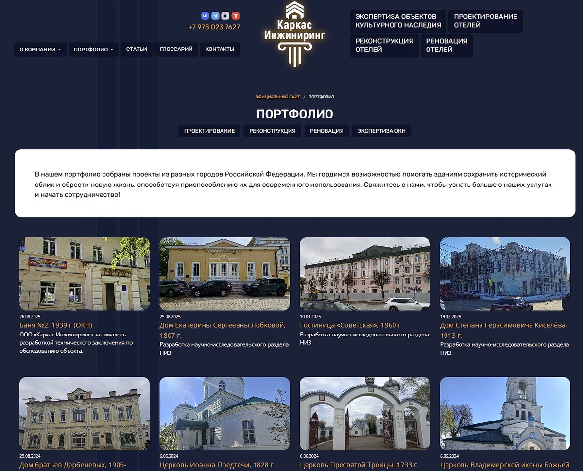 Пришло время поделиться, над чем я так упорно трудилась последний месяц. 😃 ⭐️Мы с Павлом Савченковым сделали новый проект для компании ООО «Каркас Инжиниринг», специализирующейся на проектировании, реновации и реконструкции отелей и общественных зданий. А также на экспертизе объектов культурного наследия (ОКН). ❤️ Радует, что после реконструкции или реновации многие старинные здания обретают новую жизнь. Идет большая работа по обследованию объектов культурного наследия и приспособлению их для современного использования. 🍀 Дольше всего вносила портфолио работ. Во-первых, их много. Во-вторых, каждый объект уникален, сложно было оторваться от изучения истории здания и его судьбы. ✅ Компания имеет опыт проектирования и реновации жилых объектов: частных домов, вилл, многоквартирных домов. Так что если у вас есть недвижимость, нуждающаяся в бережном обновлении - есть к кому обратиться! https://karkas-in.ru/portfolio.html