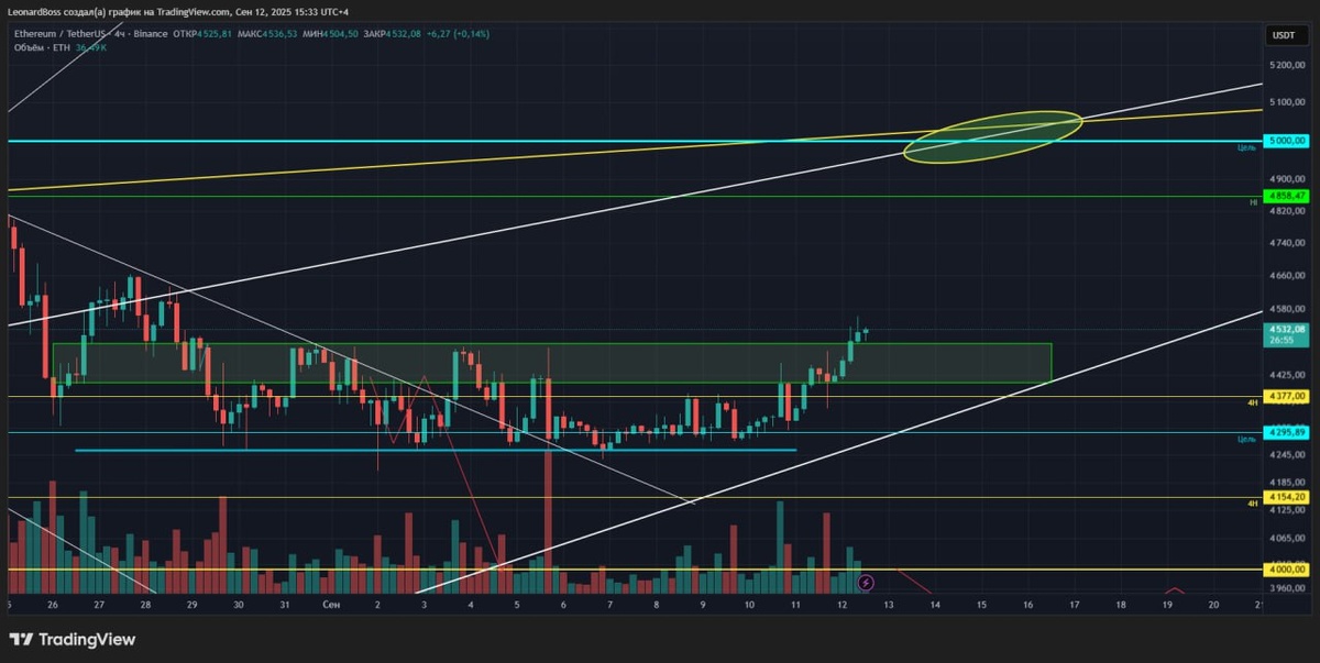 ⚠️Ну что, коллеги, эфир пробивает или вернее даже будет сказать = пропихивается через блок, который усердно долбил последние 10 дней. Если не ложный пробой (очень скоро станет понятно), то жду его первую остановку и коррекцию с обновлением HI, прямо у уровня 5000$, который очевидно, что будет пробит при таком сценарии!!