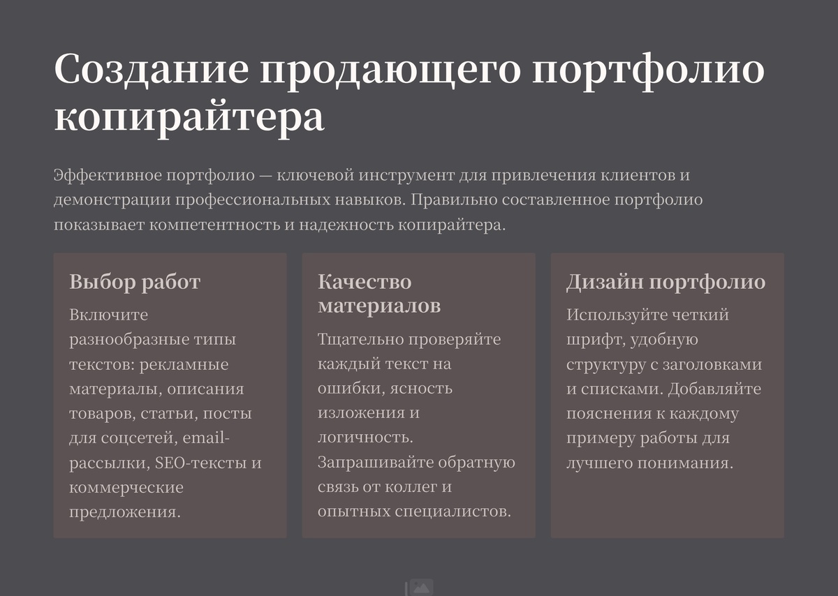 Давайте разберём подробнее каждый аспект, который важно учесть при составлении эффективного портфолио. 1. Выбор примеров работ Какие типы работ добавить? - Рекламные тексты (слоганы, креативы). - Описания продуктов и услуг. - Информационные статьи. - Посты для социальных сетей. - Тексты для email-рассылок. - Презентации и сценарии выступлений. - SEO-тексты. - Коммерческие предложения. 2. Качество представленных материалов Как добиться высокого качества? - Проверяйте каждую статью перед добавлением в портфолио на наличие ошибок. - Просмотрите содержание на предмет ясности мысли и логичности подачи информации. - Запрашивайте обратную связь от коллег или опытных копирайтеров. 3. Дизайн и структура портфолио Основные элементы дизайна: - Четкий шрифт и удобная длина строк. - Грамотное использование заголовков и списков. - Логичное разделение страниц и категорий. - Наличие пояснений к каждому примеру работы. 4. Информация о вас Что включить в раздел «Обо мне»: - Ваше имя и фамил