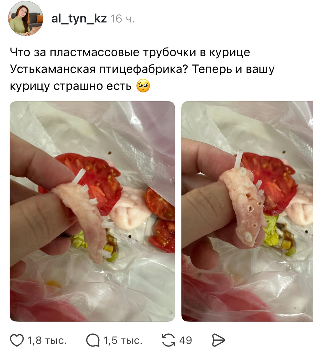 Девушка испугалась, что в курице какие-то пластиковые трубочки производители оставили.