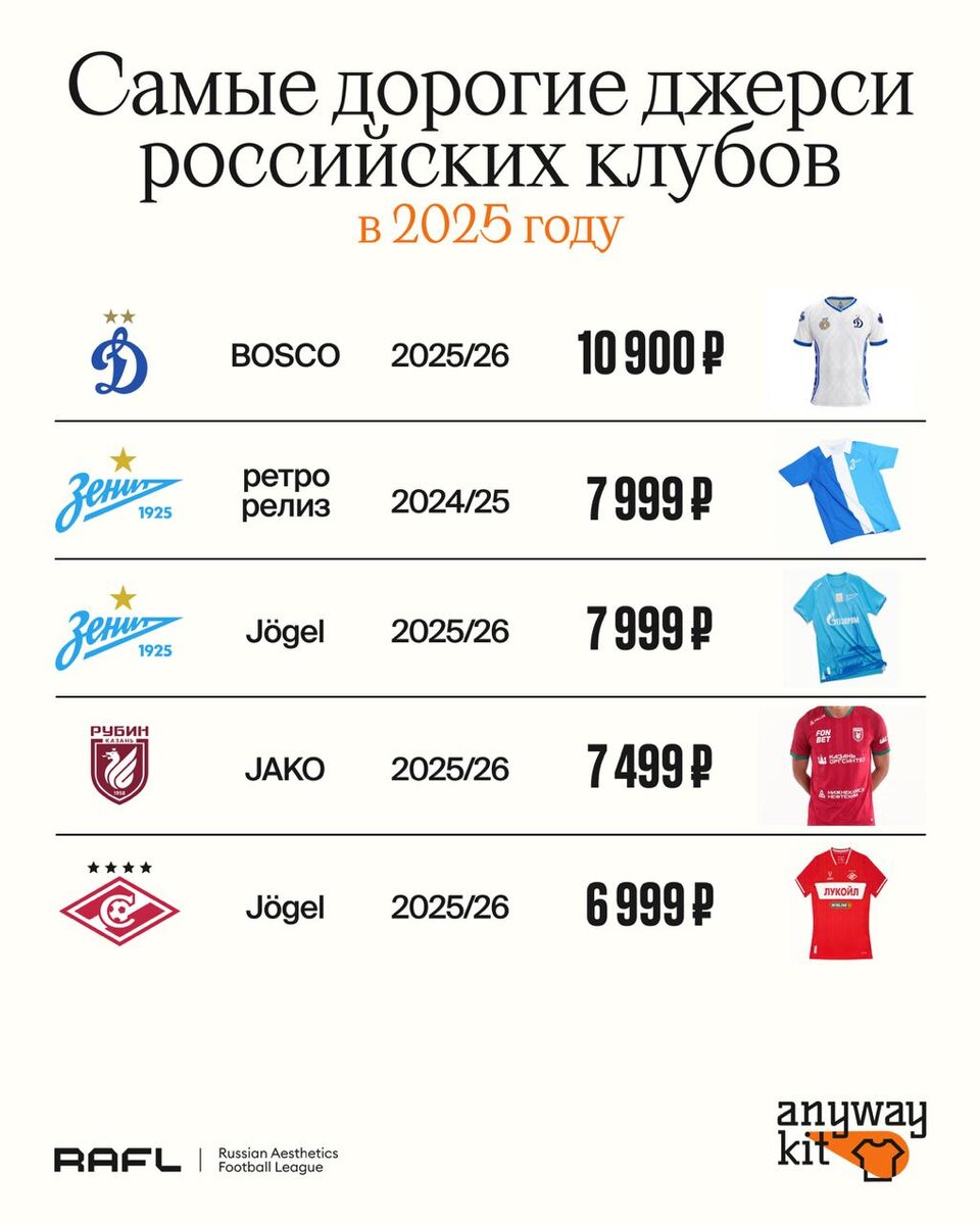 Российский рынок футбольных джерси постепенно обретает свою экономику и статистику. Совместно с Ромой из @anywaykit мы запускаем серийное исследование о ценообразовании и факторах, которые влияют на стоимость игровых маек В первом выпуске — самые дорогие комплекты сезона 2025-2026 и топ-рекорды последнего десятилетия с поправкой на инфляцию