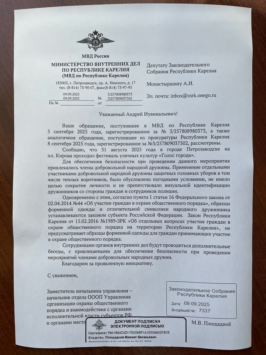 Депутат Законодательного Собрания Карелии Андрей Монастыршин выразил возмущение результатами проверки МВД по событиям 31 августа на площади Кирова. Он заявил о прямом нарушении правил проведения массовых мероприятий, когда человек с металлодетектором находился в балаклаве и бейсболке, полностью скрывавших его лицо. Монастыршин подчеркнул, что это происходило на глазах у сотрудников полиции, которые не отреагировали на нарушение. Он официально обжаловал выводы МВД через прокуратуру и добился проведения повторной проверки. Депутат настаивает на принципиальном подходе, отмечая, что массовое сокрытие лиц на публичных мероприятиях недопустимо и представляет угрозу безопасности. Он призвал к широкой огласке подобных фактов для обеспечения порядка и открытости.