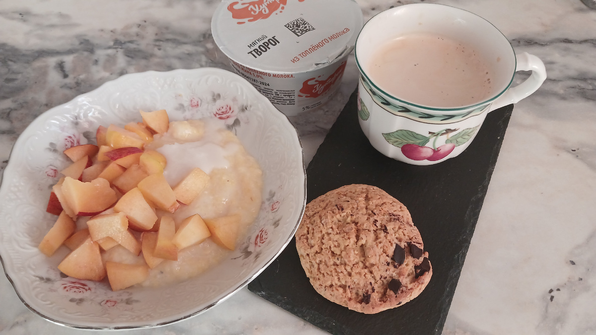 На завтрак у нас сегодня кукурузная каша с нектаринами, мягкий творог из топленого молока, чашка кофе эспрессо и печенье на кукурузной муке с шоколадом