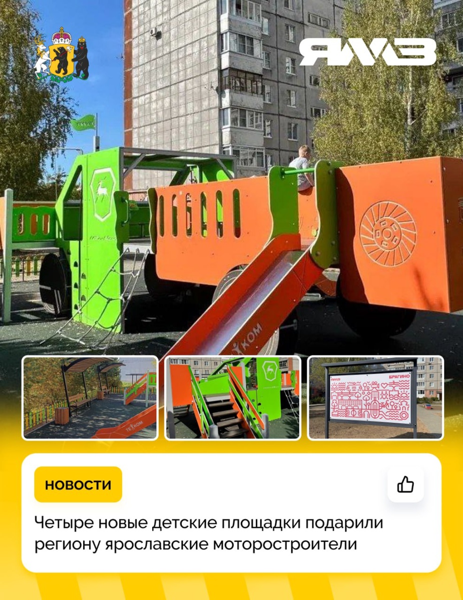 🎉 В Ярославле открылись четыре новые детские площадки — подарок от Ярославского моторного завода! Теперь у маленьких ярославцев из Дзержинского и Заволжского районов стало ещё больше пространства для игр и творчества. Современные площадки появились по адресам: 📍 4-й Норский переулок, 3 📍 Улица Урицкого, 67 📍 Ленинградский проспект, 64, корпус 3 📍 Сквер на проспекте Машиностроителей Игровые комплексы выполнены в виде легендарного автомобиля «ГАЗон Next» — яркие, безопасные и с развивающими элементами. Здесь есть всё для активного отдыха.
