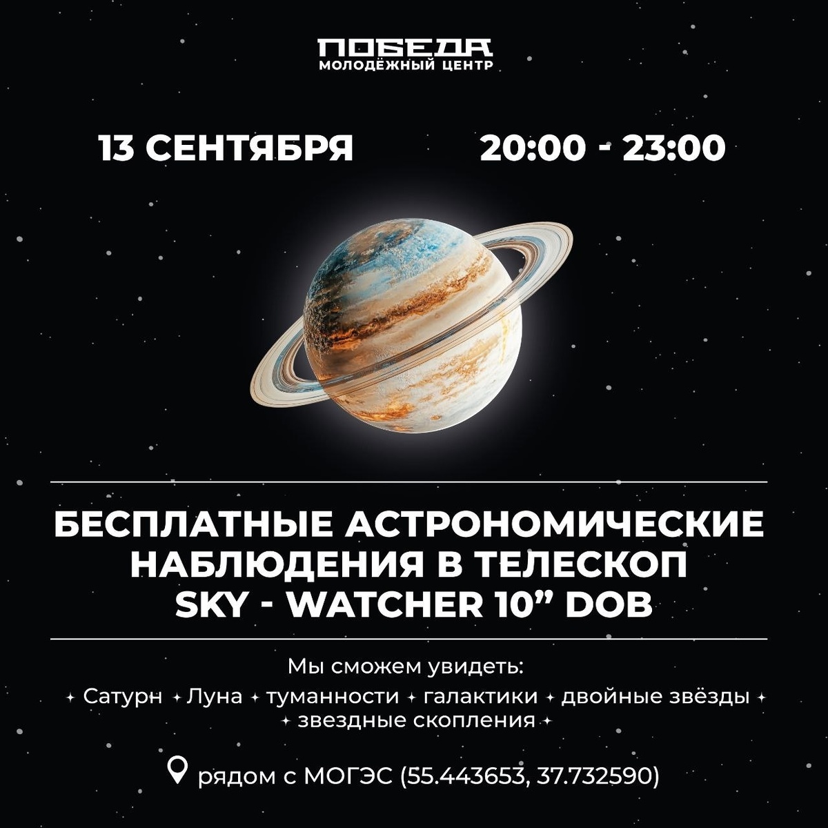 ✨ Всё еще не знаешь чем заняться в эту субботу? Есть для вас предложение... 13 сентября в 20:00 встречаемся у МОГЭС (55.443653, 37.732590) для волшебного вечера под звёздами! В телескоп увидим Сатурн, Луну и таинственные туманности! 🪐🌙✨ Бесплатно! Берите тёплые вещи, термос с чаем, вкусняшки и хорошую компанию! 👉 Зарегистрируйтесь здесь, чтобы не пропустить: clck.ru/3P8A4w Ждём вас! 💖 📆 13.09.2025🕒20:00 🏢 Молодёжный центр "Победа" 📍 Домодедово, 30-Летия Победы пл., д. 2 💰 Вход свободный❗️ ✅ Мероприятия Домодедово https://dzen.ru/id/66f10385cc4c5a16f7b5fb02 http://vk.com/domodedovo_events http://dzen.ru/domodedovo_events