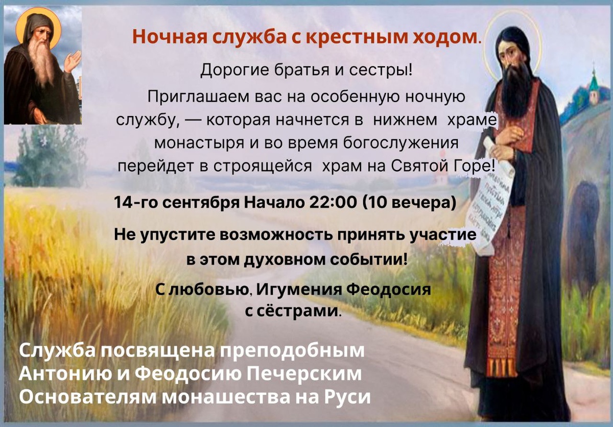 Братья и сестры, ждём всех, кто сможет на 🍁ночную службу с крестным ходом 14 сентября в 22.00