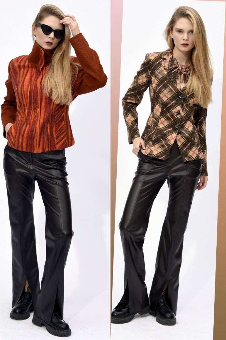 Трендовые брюки из экокожи, естественно в шоколадном цвете, стилизованные под 70-е.