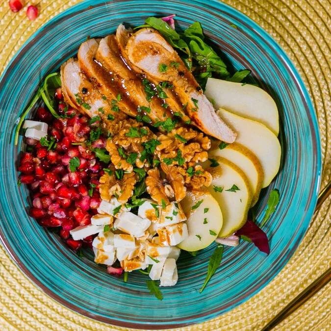 Продолжаем рубрику советы beauty!🍽️ Идея ужина🔥 Салат с курицей и гранатом Ингредиенты Гранат - 1/2 стакана Куриная грудка - 100 г Сыр фета 35% - 50 г Груша (маленькая) - 1/2 шт. Смешанная зелень - 100 г Грецкие орехи - 1 ст. л Бальзамический уксус - 1 ст. л Мед - 1 ч. л Дижонская горчица - 1 ч. л Оливковое масло - 1 ч. л Соль и перец - по вкусу Шаг 1 из 7 Посолите и поперчите куриные грудки по вкусу. Шаг 2 из 7 На разогретой сковородке с добавлением масла приготовьте курицу на среднем огне до румяной корочки. По готовности отложите в сторону остывать. Шаг 3 из 7 Для заправки. В небольшой миске взбейте вместе оливковое масло, бальзамический уксус, мед, дижонскую горчицу, соль и перец по вкусу. Шаг 4 из 7 Нарежьте грушу тонкими ломками. Шаг 5 из 7 Нарежьте куриную грудку на слайсы. Шаг 6 из 7 В салатницу добавьте салат, куриную грудку, грушу и зёрна граната. Шаг 7 из 7 Добавьте грецкие орехи и сыр фету, полейте заправкой и перемешайте салат. Подавайте к столу украсив свежей зеленью