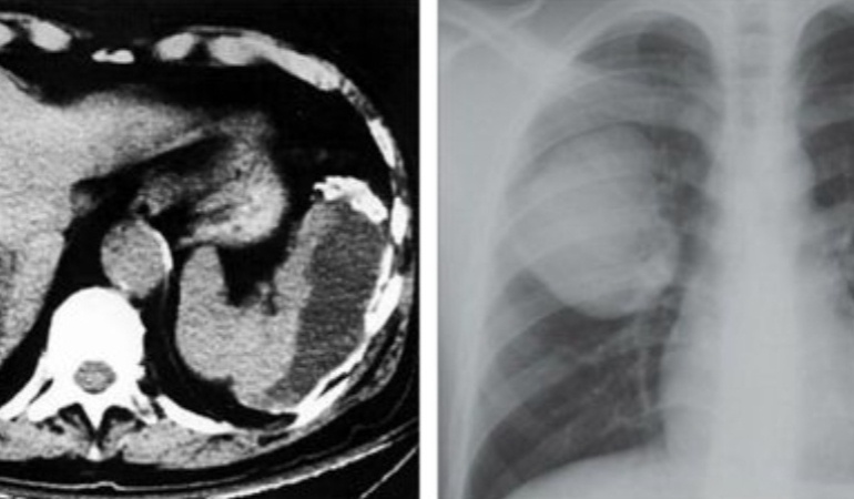 На рентгене было выявлено наличие воздуха и избытка жидкости в плевральной полости, а также заподозрен прорыв кисты.