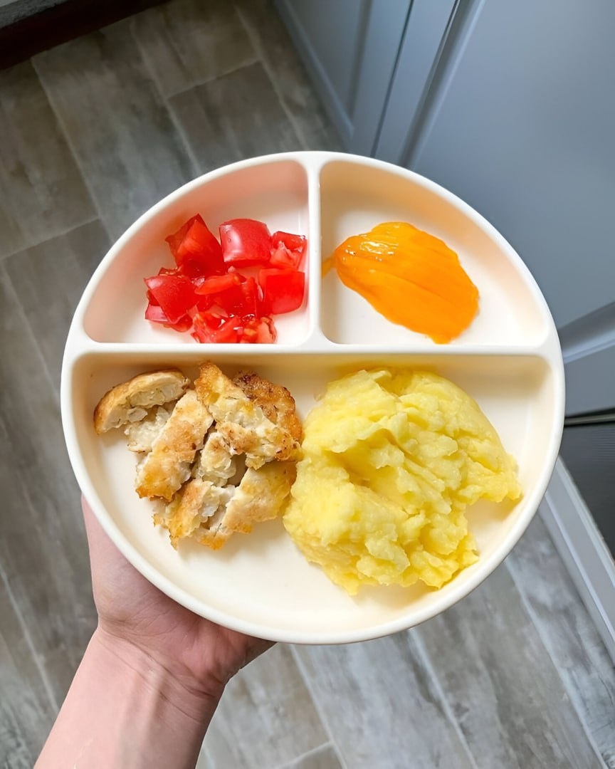 Сбалансированная тарелка 🌈 Самоприкорм – это настоящий вызов, да и ответственность немаленькая. Хочется, чтобы ребёнок сам познавал мир вкусов, но и полезные вещества получал исправно. Как же собрать сбалансированную тарелку? 📔 Представьте тарелку, визуально разделённую на три части – это ваш ориентир при подготовке еды: ⭐️ Белки (мясо, рыба, бобовые, яйца). Они нужны для мышц, органов и иммунитета. ⭐️ Злаки/Углеводы (макароны, крупы, картофель). Они дают энергию для активности малыша и работы мозга. ⭐️ Овощи и Фрукты. Клетчатка помогает пищеварению, а витамины защищают от болезней. Рекомендуется употреблять разнообразные овощи и фрукты различных цветов по правилу радуги, чтобы получить максимум питательных веществ. Предлагайте разные продукты, комбинируйте их, и смотрите, что понравится вашему маленькому гурману. Не переживайте, если малыш что-то выплюнул или отказался есть. Это нормально! Просто попробуйте предложить это же блюдо в другой раз, или в другой форме. Главное –