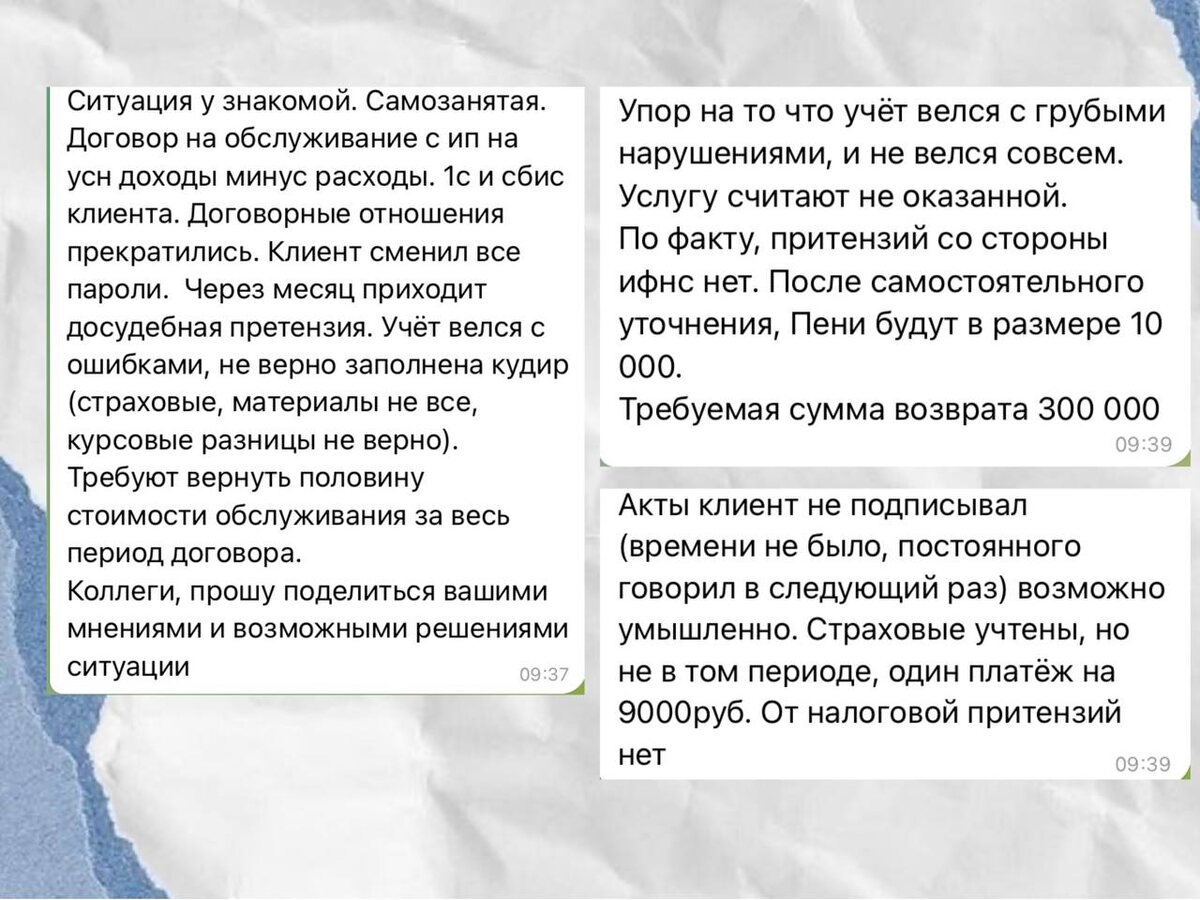 (Для подруги интересуюсь). 🙋♀️ Ситуация, которую обсуждал весь чат: клиент требует половину стоимости обслуживания за весь период назад. 💱 🦞Важно: мы не знаем всей ситуации, можем только строить догадки: “Ситуация у знакомой. Самозанятая. Договор на обслуживание с ип на усн доходы минус расходы. 1с и сбис клиента. Договорные отношения прекратились. Клиент сменил все пароли. Через месяц приходит досудебная претензия. Учёт велся с ошибками, неверно заполнена кудир (страховые, материалы не все, курсовые разницы не верно). Требуют вернуть половину стоимости обслуживания за весь период договора. Упор на то, что учёт велся с грубыми нарушениями, и не велся совсем. Услугу считают не оказанной. По факту, претензий со стороны ифнс нет. После самостоятельного уточнения, Пени будут в размере 10 000. Требуемая сумма возврата 300 000 ₽. Коллеги, прошу поделиться вашими мнениями и возможными решениями ситуации” Еще в чате автор писала, что десятка не закрыта. Мы бы и рады поделиться, но