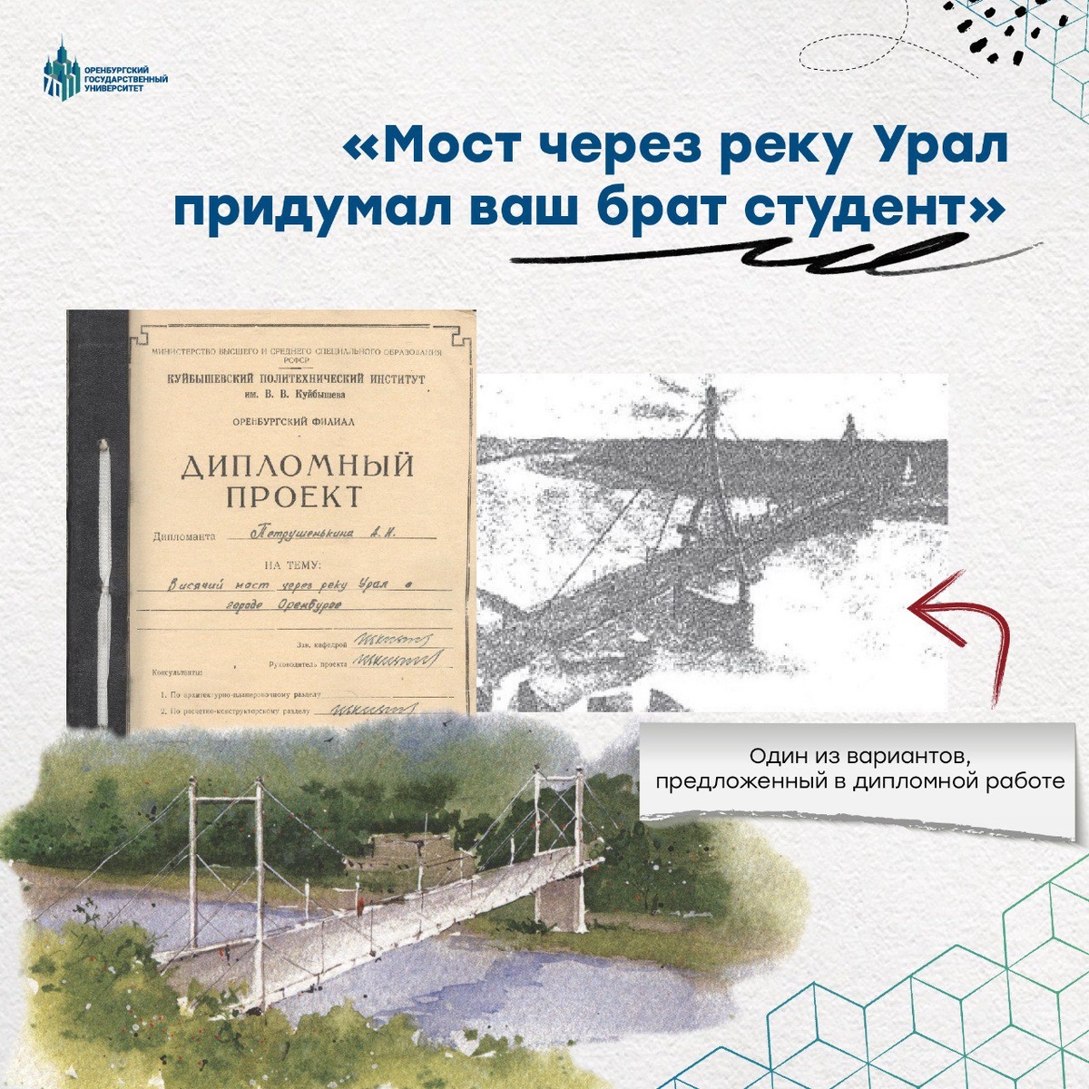 «Мост через реку Урал придумал ваш брат студент» 🖍 Именно так писали газеты в 80-е годы прошлого столетия. Наше очередное погружение в историю университета будет посвящено выпускнику строительного факультета Оренбургского политехнического института (ныне ОГУ) 1969 года Аркадию Петрушенькину. Именно его дипломная работа легла в основу капитального проекта современного пешеходного моста через реку Урал 🙌 Проект был подробнейшим образом проработан, представлен на 18 листах чертежей с пояснительной запиской. Рецензировал его инженер-мостовик Владимир Цепков, работавший в то время главным инженером Оренбургского мостостроительного управления. Специалист оценил работу на «отлично». Данная работа оказала влияние как на ускорение проектирования и строительства капитального пешеходного моста, так и на то, каким он должен быть ✨ #ОГУ #в_ОГУ #OSU #70летОГУ