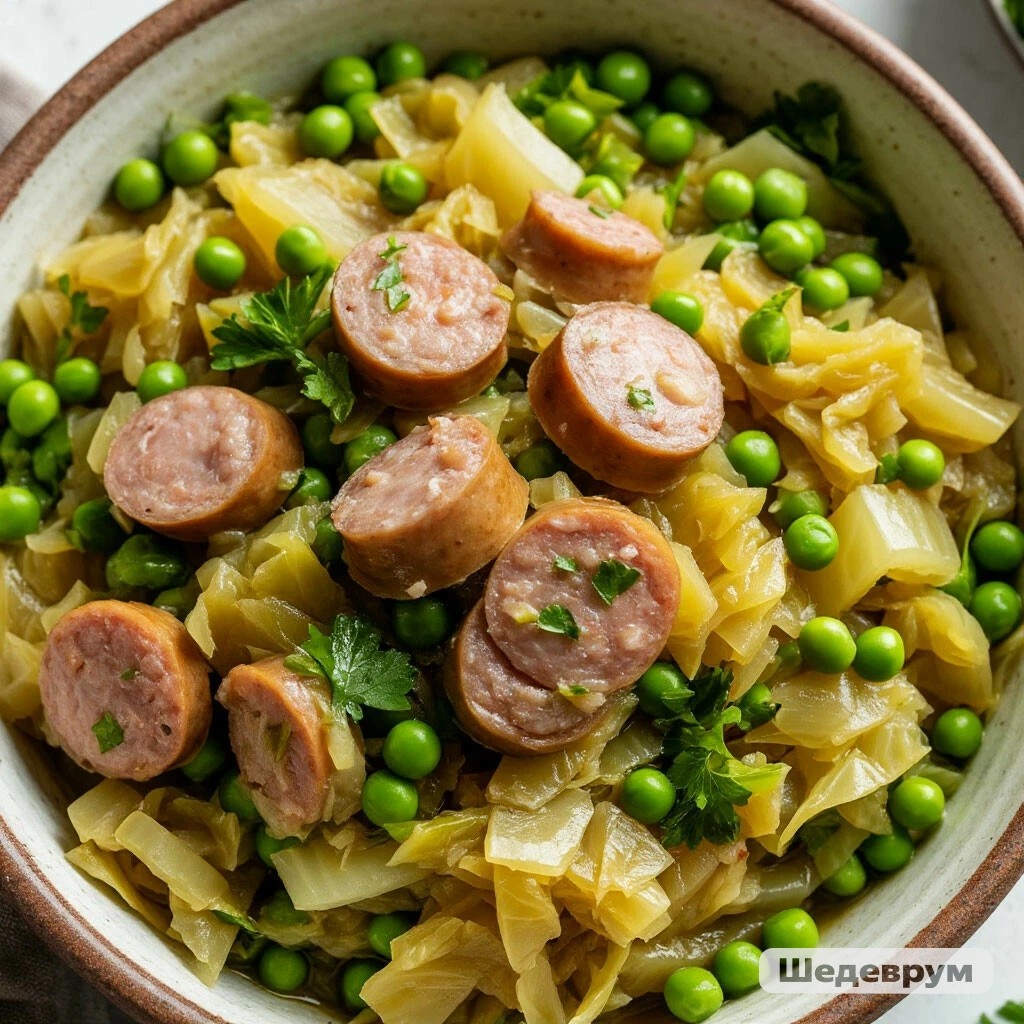 Тушеная капуста с сосисками и горошком