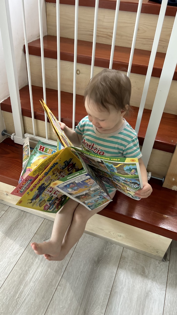 Сегодня, пока я готовила завтрак, Ксюша заглянула в кабинет и стащила оттуда книги и журналы. Потом села с важным видом на лестницу и стала «читать». Болтает на своём китайском. ))