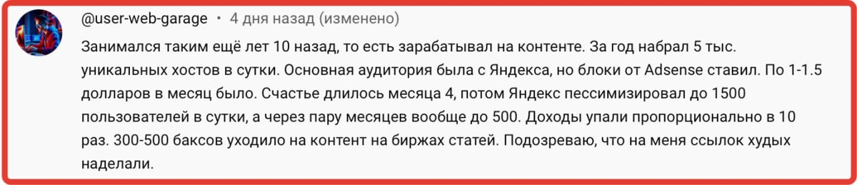 По поводу заработка на сети сайтов. Комментарий написали, согласен - раньше было нажористо (1-1.5к$ в месяц доход бы у человека), сейчас идея слегка утопичная. См. картинку. Скорее всего делать свою сеть можно не под рекламные блоки, а под продвижения своего же продукта... А реклама - просто для того, чтобы окупить домены и хостинг :) Русский ИТ бизнес