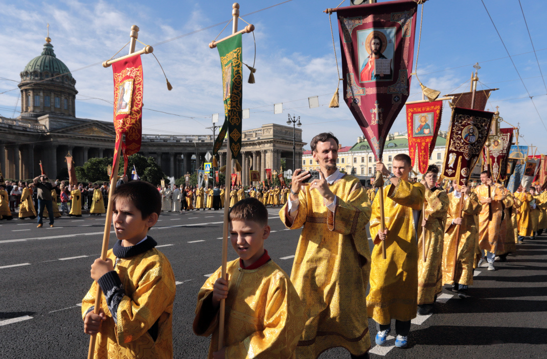 По Невскому проспекту 12 сентября прошел традиционный крестный ход от Казанского собора к площади Александра Невского. Мероприятие собрало десятки тысяч человек. В первых рядах вместе с представителями митрополии шли чиновники Смольного и депутаты. Как это выглядело - в снимках фотокорреспондента ЗАКС.Ру Михаила Масленникова. По предварительным оценкам Смольного, в крестном ходе в 2025 году приняли участие более 70 тысяч человек Председатель Законодательного собрания Александр Бельский Ректор Санкт-Петербургского Государственного университета Николай Кропачев и председатель Заксобрания Александр Бельский Вице-губернатор Петербурга Наталья Чечина, председатель Заксобрания Александр Бельский, ректор СПбГУ Николай Кропачев Среди молодежных объединений в крестном ходе приняли участие сторонники "Молодой гвардии "Единой России", которые решили пройти со своей символикой