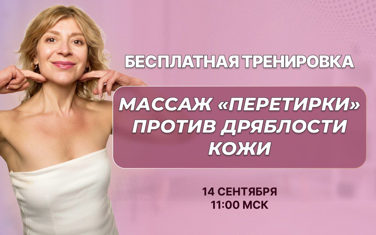 🆘 ОТКРЫТАЯ ТРЕНИРОВКА «ПЕРЕТИРКИ» ПРОТИВ ДРЯБЛОСТИ КОЖИ Кто заметил, что лицо после лета меняется? Морщины стали заметнее из-за более активного солнца, морская соль и ветер подсушили кожу, а дачный сезон — вообще беда для женской красоты😭 Работаем в наклоне, напрягаем шею... в результате имеем отечность, второй подбородок, дополнительные морщины! Предлагаю не сидеть сложа руки, а позаниматься вместе на открытой тренировке и стереть следы летнего воздействия на красоту нашего лица! ⚡️В прямом эфире сделаем эффективный антивозрастной МАССАЖ «ПЕРЕТИРКИ»⚡️ Одна из основных причин старения — фиброзные спайки в коже. Именно из-за них кожа становится более дряблой и безжизненной, а на лице появляются заломы и морщины. Интенсивный глубокий массаж «ПЕРЕТИРКИ» работает напрямую со спайками и воздействует точечно на возрастные проблемы🙌 За одну тренировку вы: 🔥 улучшите кровообращение и тонус 🔥 подтяните овал лица безопасными естественными методами 🔥 вернете упругость коже 🔥 запустит