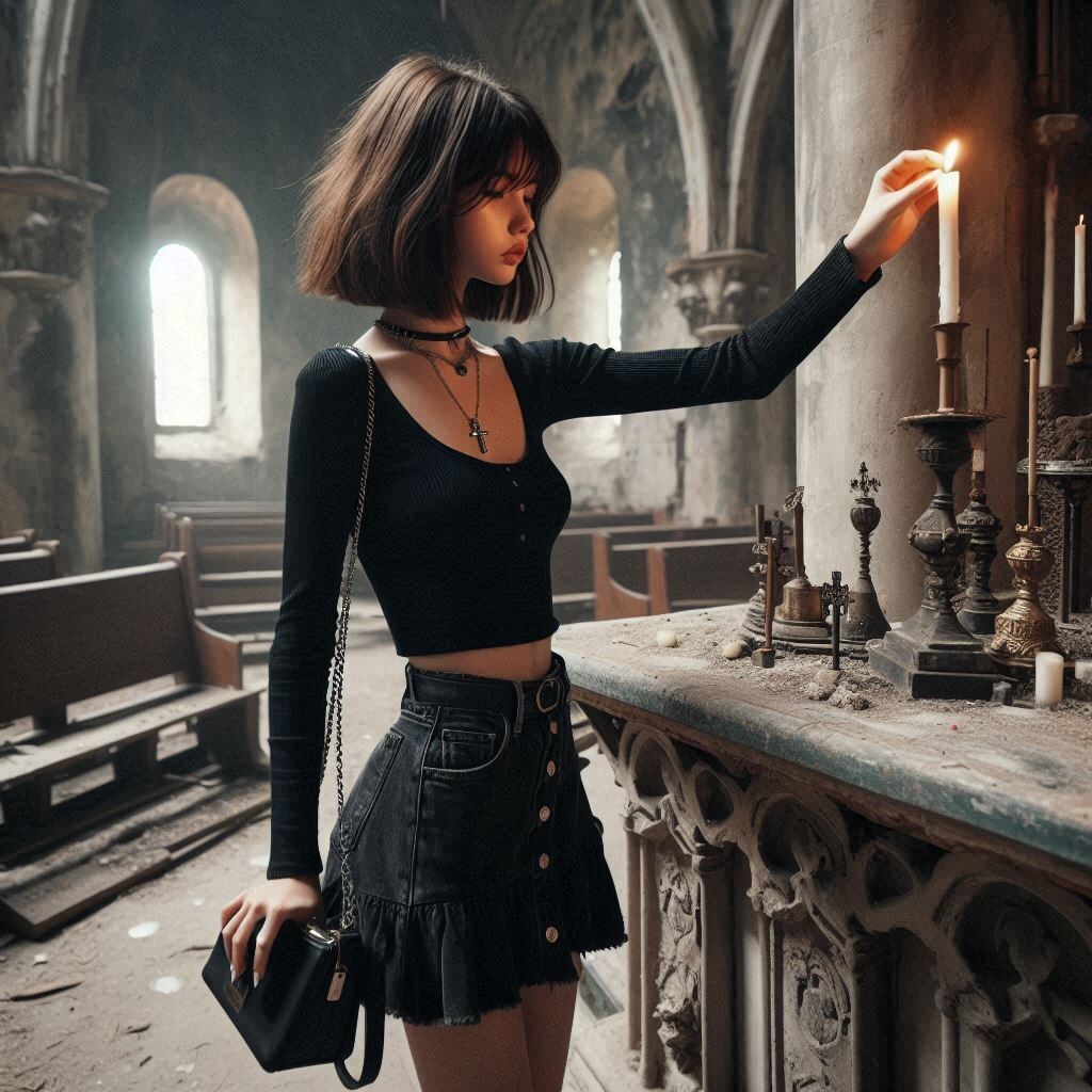 Тине здесь очень нравилось, потому что тут никогда не было людей. В отличие от действующих городских церквей, тут она чувствовала себя по-настоящему уединённой с Богом, в существование которого она сама до конца не верила. Точнее, она не верила, что Бог верит в неё. Несмотря на строительную пыль от раскрошенных камней, залежи мусора и осколки пивных бутылок вокруг, девушка ощущала себя здесь комфортно. Ведь для неё главным было то, что здесь её точно никто не подслушает и не помешает ей говорить с НИМ откровенно. Девушка подняла свои азиатские карие глаза на огромное деревянное распятие Христа, прогнившее до самого основания. Она не спеша подошла к покачивающемуся при каждом прикосновении алтарю. Достав из своей сумочки заранее приготовленную церковную свечку, девушка коснулась указательным пальцем её основания — и воск стал медленно плавиться, как от огня. Размягчив воск, девушка поставила свечу на каменный алтарь, который был весь залит жёлтым воском от сотни старых свечей.