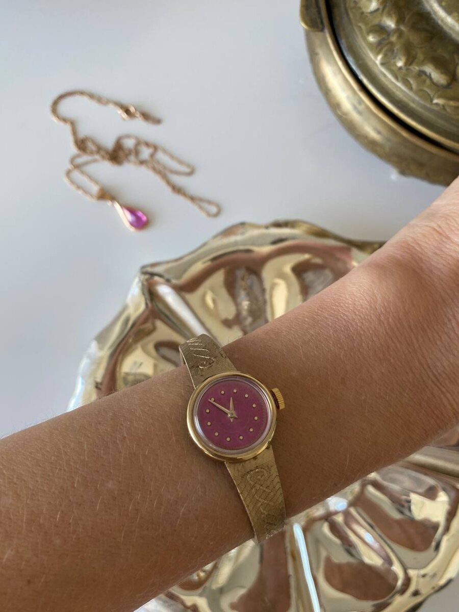 Что имеем? Практически идеальное состояние. Стекло чистое, без потëртостей; прекрасный циферблат в розовом цвете и позолоченный браслет в розовом золоте без утрат… На корпусе нанесено клеймо AU, что означает золотое покрытие в 5 мм. Немного, бывает и больше, но все равно достаточно крепкое.