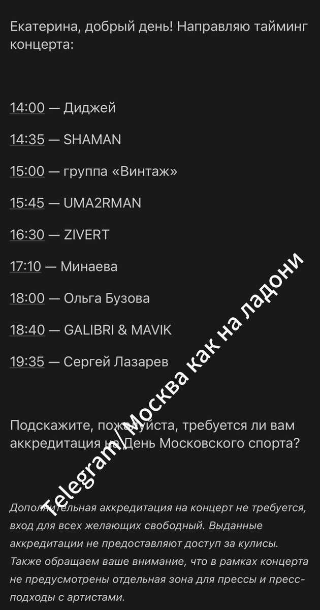 В ответ на пост 🔥 Тайминг концерта ко Дню Московского спорта в «Лужниках» #концертыналадони Ребяяяята, ждала несколько дней и наконец-то ответили организаторы! Быстрее сохраняйте тайминг на картинке и поддержите 🔥 🗓️ 13 сентября начало концерта - 14:00 📍 Лужники 💰 Бесплатно @moscowplan