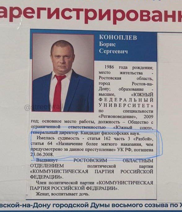 Бандит пытается выиграть выборы в Ростовской области от КПРФ. В Ростовской области кандидат в депутаты из партии коммунистов имеет свое криминальное прошлое. ────────── ⚡️Важные новости – без лишнего шума!⚡️ Подпишись на канал и получай только суть: оперативно, чётко, по делу! 👉 ИнфоСплетник | @infospletnik