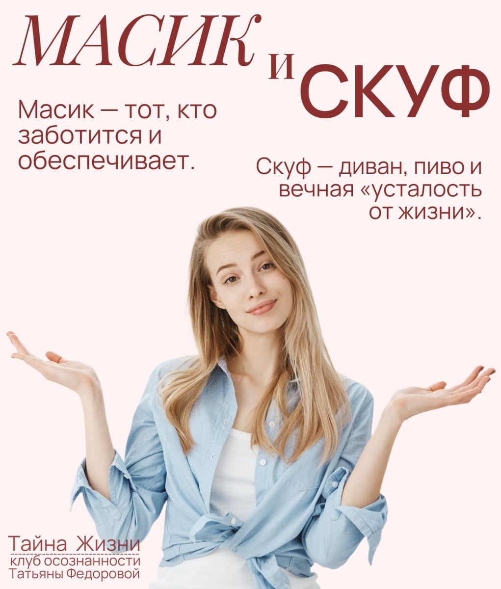 [Масик и Скуф] Масик - тот, кто заботится и обеспечивает.Масик — заботится и вкладывается. Скуф - диван, пиво и вечная «усталость от жизни». Оба слова — из одной серии, как и «редфлаг». Это язык, которым молодое поколение учится называть простыми словами то, что раньше приходилось терпеть молча. А у вас был опыт и того, и другого? Кого легче узнать с первого взгляда?