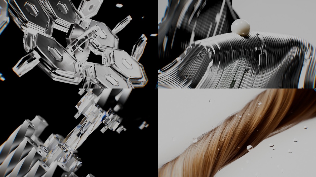 Студия Reframe из Сеула создала для COSRX промо-ролик Peptide 132, который отказывается от привычных кодов beauty-визуализации в пользу абстрактного CGI-языка. Авторы заявили задачу «визуализировать 3D-макромир ядра волоса современным и абстрактным способом» — и сделали это через образ волоса как металлической ткани. Этот художественный приём сразу задаёт новые ассоциации: крепость, блеск, строгая геометрия и безупречная выверенность форм становятся метафорой здоровья и силы волос. Ключевая находка ролика — тканевые структуры, составленные из литых металлических нитей, которые формируют цельное и прочное полотно. Визуально это решение работает как образ пряди волос, собранной из множества мелких компонентов. В динамике симуляции ткань то расплетается, то вновь сцепляется, показывая метафорический процесс разрушения и восстановления кератиновых связей. Именно металл здесь становится проводником концепции: его физические качества превращены в метафору прочности и устойчивости волос посл