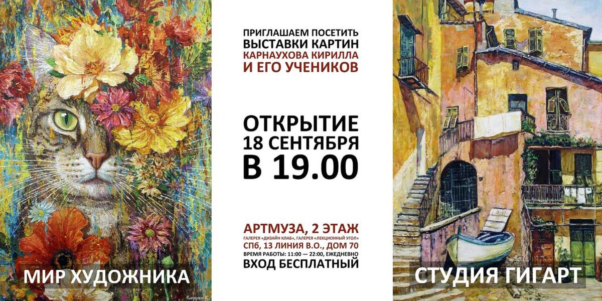 Друзья, приглашаю в Артмузу, на ОТКРЫТИЕ ДВУХ ВЫСТАВОК!🎨 ОТКРЫТИЕ В СЛЕДУЮЩИЙ ЧЕТВЕРГ, В 19.00 !!! 🕖🎉🎊 Будут представлены работы Карнаухова Кирилла и его учеников (студия Гигарт). Экспозиция пройдёт с 18 сентября -18 ноября.☝ Санкт-Петербург, 13 линия Васильевского острова, дом 70-72. ВХОД СВОБОДНЫЙ! https://share.google/2MRGlPYUPN0zNiqbf https://artmuza.spb.ru/events/3112-vystavka-studija-gigart-pod-rukovodstvom-kirilla-karnauhova.html https://artmuza.spb.ru/events/3110-vystavka-mir-hudozhnika-kirilla-karnauhova.html