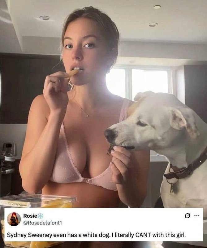 Мы живем в мире где медийному человеку ( не говоря уже об одной из саааамых популярных и востребованных молодых звезд Голливуда) может прилететь за все…даже за собаку. Так, Сидни Суини в очередной раз была обвинена в расизме: У Сидни Суини даже собака белая. Я НЕ МОГУ с этой девушки. Ранее Реклама American Eagle, в которой снялась Сидни, вызвала негативную реакцию в социальных сетях. В частности, пользователи увидели в игре слов «отличные джинсы» (great jeans) и «отличные гены» (great genes) намек на евгенику и риторику о расовом превосходстве. Дальше рассказывать что было?)