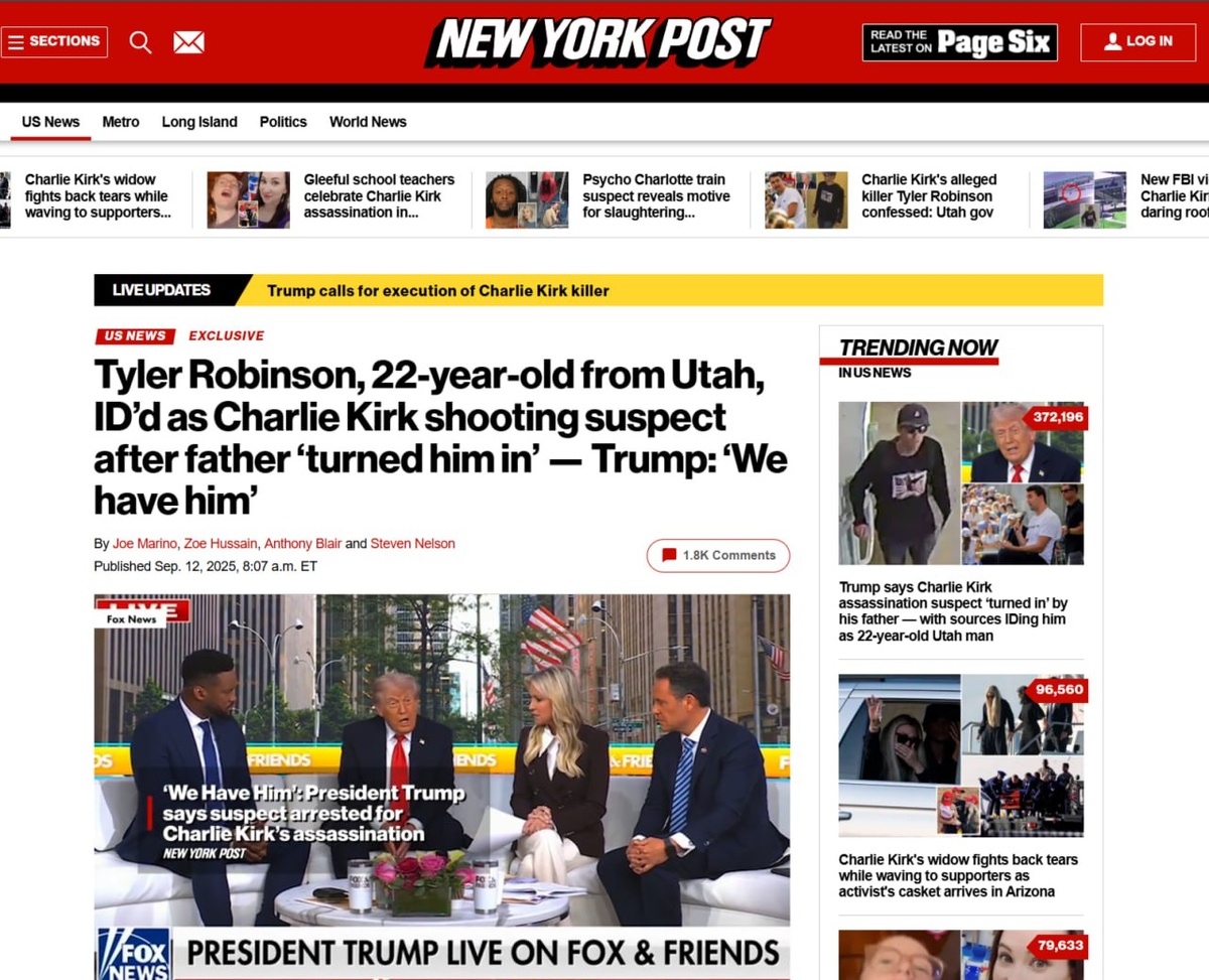 The New York Post: Президент Трамп объявил в пятницу утром, что подозреваемый в убийстве Чарли Кирка был выдан его отцом