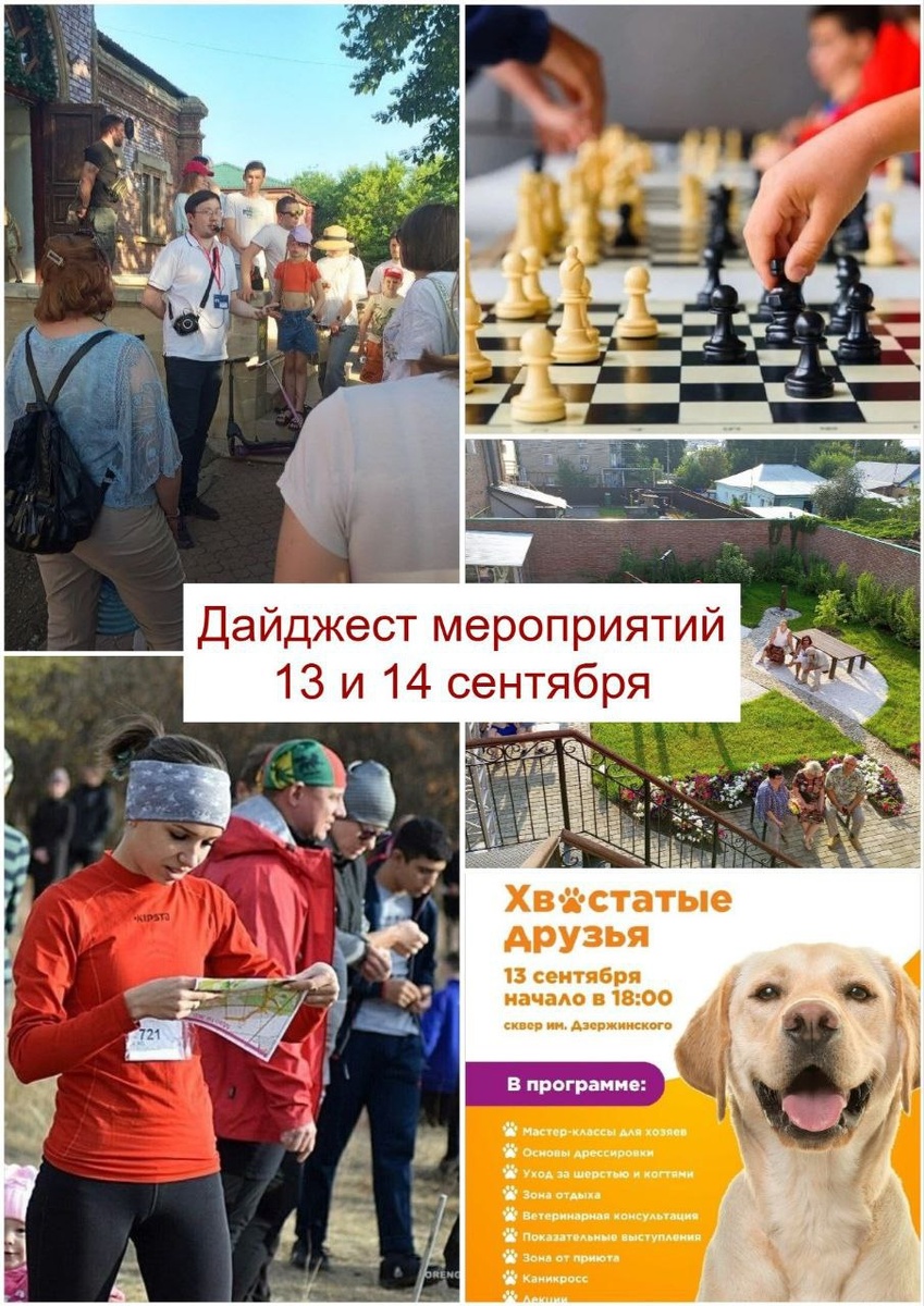 Мероприятия в Оренбурге на 13-14 сентября: 13 сентября • 9:00 – Забег «5 вёрст» в парке «Берёзка» • 10:00 – Футбольный турнир «Золотая осень» (стадион «Нефтяник», Берды) • 11:00 – Кубок шахматных федераций (спортшкола «Прогресс») • 12:00 – Соревнования по дрифту (ТРЦ «Кит») • 15:00 – Чемпионат по спортивному ориентированию (Зауральная роща) • 18:00 – Закрытие сезона в доме-музее Гагариных • 18:30 – Праздник домашних животных (сквер Дзержинского) • 19:00 – Экскурсия «Оренбург вчера, сегодня, завтра» (ул. Советская) • 19:00 – Мастер-класс по ZUMBA (площадь у Музея истории) 14 сентября • 9:00 – Продолжение футбольного турнира («Нефтяник») • 11:00 – Второй этап шахматного кубка («Прогресс») Вход на все события свободный.