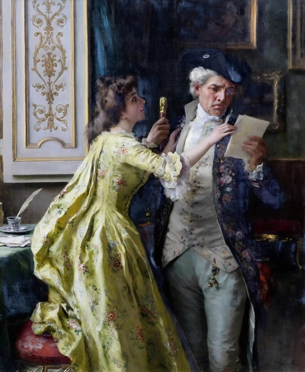❣️«Перехваченное письмо» — захватывающая жанровая картина итальянского художника Федерико Андреотти, созданная в конце XIX века. ⚡️На полотне запечатлен драматический момент семейного конфликта: красивую молодую женщину застали за написанием любовного письма, и её супруг, случайно обнаружив послание, с гневом и болью читает его. 😳Эмоции героев — от смятения и тревоги до злости и разочарования — выражены очень ярко, что создаёт напря👑жённую атмосферу на холсте. Обстановка и одежда персонажей — дорогие и изысканные — говорят о высоком социальном статусе пары, а стопка писем на столе служит свидетельством возможной измены. ⚜️Художник мастерски передал сложные человеческие чувства и моральные дилеммы, приглашая зрителя задуматься о верности, любви и последствиях предательства.🖌 Эта сцена оставляет открытым развитие сюжета, позволяя каждому интерпретировать её по-своему.