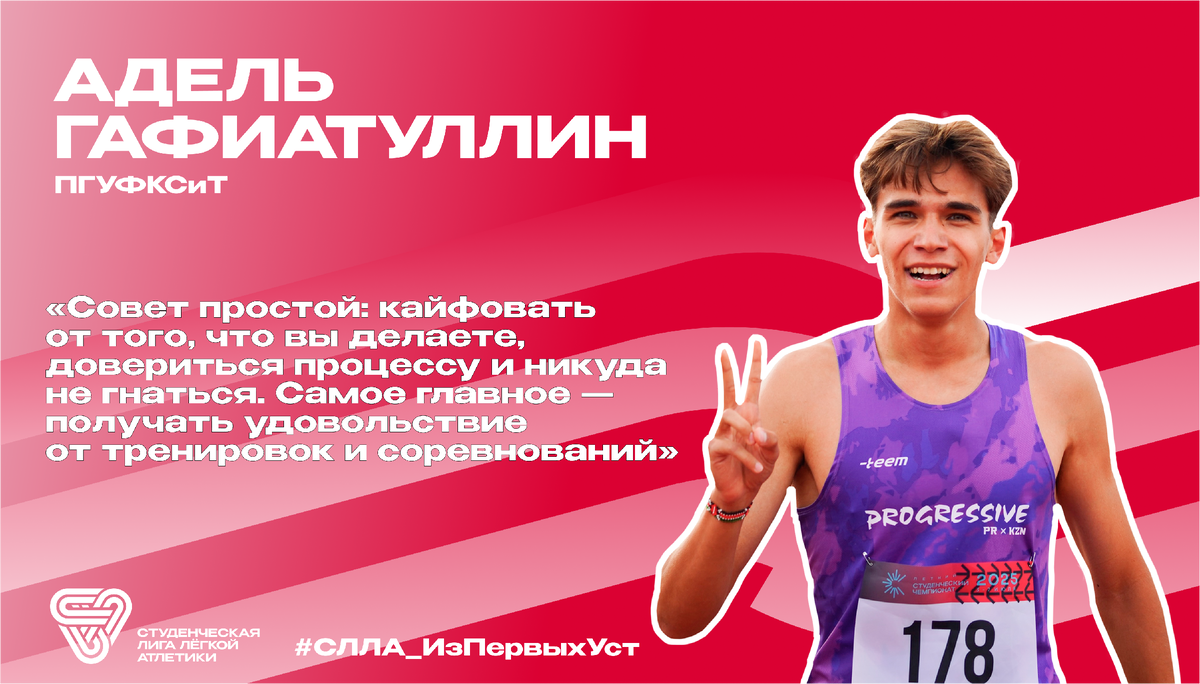 Адель Гафиатуллин — студент ПГУФКСиТ, мастер спорта по легкой атлетике в беге на 800 метров, победитель и призер студенческих и всероссийских стартов. Время знакомиться с ним! Как ты вообще попал в легкую атлетику, как развивался там твой путь до того, что есть сейчас? Попал в лёгкую атлетику в 2014 году, мне тогда было восемь лет. Привёл меня сосед. Я выбирал между шахматами и лёгкой атлетикой, оба занятия мне нравились. Чтобы определиться, мне сказали бросить монетку — и выпала лёгкая атлетика. Так и остался в спорте. Как сейчас обстоят дела с шахматами? Как-то этот навык пригодился в жизни? Шахматами больше не занимаюсь, очень редко играю, уже почти забыл. Но в жизни это точно пригодилось: шахматы развивают и качают мозг и мышление — это определенно на меня повлияло. На кого ты сейчас учишься? Какие планы на будущее? Я учусь в спортивном вузе на тренера по легкой атлетике, о будущем пока особо не думаю, больше зациклен на спорте. Уже тренировал любителей, но сейчас хочется больше уй