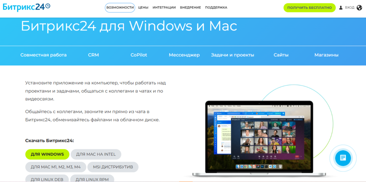 Многие знают, что Битрикс24 работает прямо в браузере — зашёл на сайт, ввёл логин и пароль, и можно работать. Но есть и другой, более удобный вариант: скачать приложение на компьютер и смартфон. Тогда не придётся каждый раз авторизоваться, а все инструменты будут под рукой. Скачать программу можно на Windows, Mac и Linux. Сделать это легко по ссылке https://www.bitrix24.ru/features/desktop.php Либо же прямо из интерфейса вашего портала, где тоже размещены ссылки. Установка занимает несколько минут и не требует специальных навыков. В отличие от браузера на десктопном приложении можно: - сделать интеграцию с диском на компьютере - записывать аудио и видеовстречи - не нужно постоянно вводить логин и пароль Фактически, с программой на компьютере вы получаете весь Битрикс24 в одном окне. Если вы часто работаете вне офиса, удобнее всего использовать приложение для телефона. Скачать его можно бесплатно в App Store, Google Play, AppGallery или RuStore. Ссылка для скачивания https://www.bitrix2