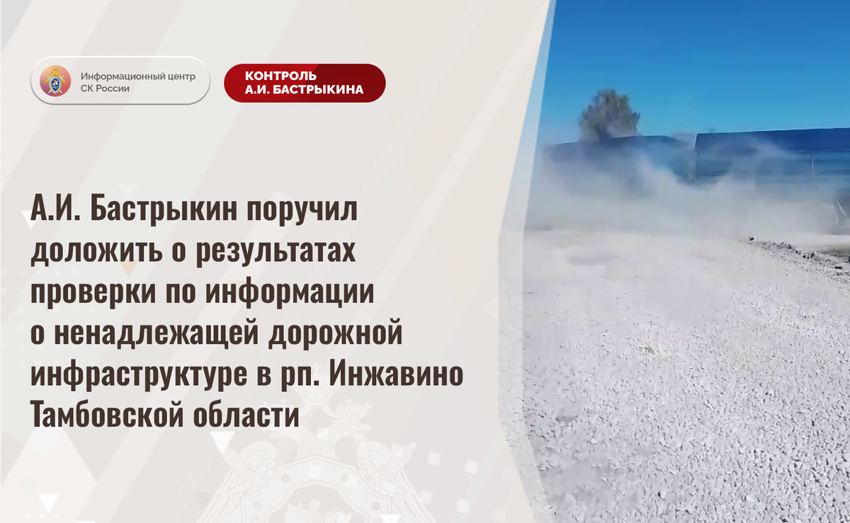 А.И. Бастрыкин поручил доложить о результатах проверки по информации о ненадлежащей дорожной инфраструктуре в рп. Инжавино Тамбовской области В телеграм-канале сообщается о нарушении прав жителей рабочего поселка Инжавино Тамбовской области на качественную дорожную инфраструктуру. На протяжении длительного времени автомобильная дорога по улице Фрунзе находится в непригодном состоянии в связи с наличием на поверхности многочисленных повреждений и размытием грунтового полотна при выпадении осадков. В текущем году организованы ремонтные работы, однако вместо укладки асфальтового покрытия выполнена отсыпка объекта известковым щебнем. В результате при передвижении транспортных средств в воздухе образуется большое количество едкой пыли, провоцирующей возникновение у жителей аллергических реакций, а также оказывающей негативное воздействие на экологическую обстановку. В СУ СК России по Тамбовской области организована процессуальная проверка. Председатель Следственного комитета Российской Фед