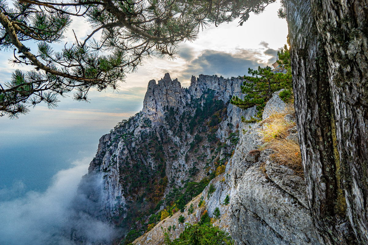 Если повезет, внизу в Ялте будет пасмурно, а вы будете находится выше облаков, они будут у вас под ногами и у вас будет солнечно. Бывают шикарные световые эффекты с туманом и солнцем одновременно, а зимой, укутанные инеем сосны.
