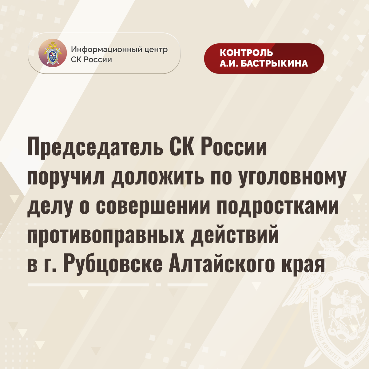 Председатель СК России поручил доложить по уголовному делу о совершении подростками противоправных действий в г. Рубцовске Алтайского края В телеграм-канале сообщается о совершении подростками противоправных действий в городе Рубцовске Алтайского края. Несколько учениц одного из образовательных учреждений города жестоко избили одноклассницу, требовали встать на колени и принести извинения. Происходящее фиксировалось на камеру мобильного телефона. Отмечается, что несовершеннолетние систематически издеваются над сверстниками, однако мер реагирования не принимается. В СУ СК России по Алтайскому краю по данному факту возбуждено уголовное дело. Председатель Следственного комитета Российской Федерации Александр Иванович Бастрыкин поручил руководителю СУ СК России по Алтайскому краю Игорю Владимировичу Колесниченко представить доклад о предварительных и окончательных результатах расследования уголовного дела. Исполнение поручения поставлено на контроль в центральном аппарате ведомства. #След
