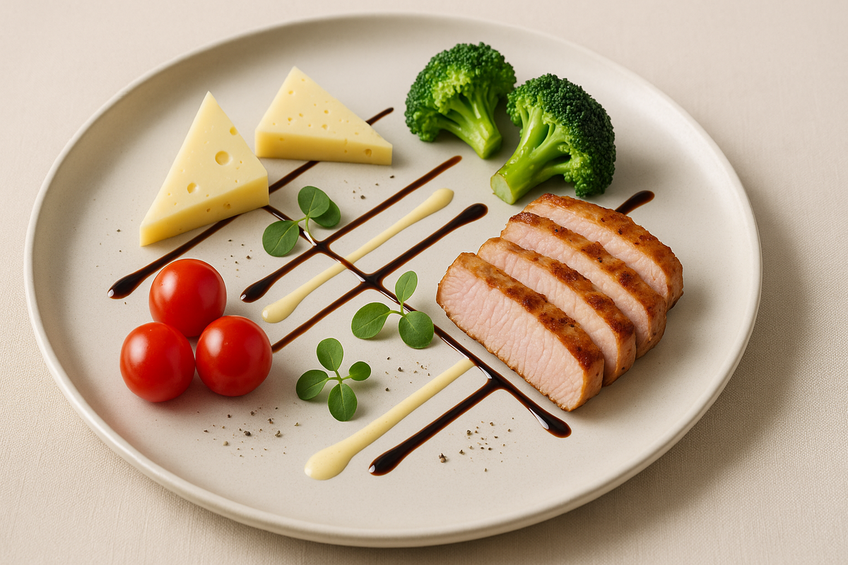 - Играйте с визуальным весом. Крупные и «тяжёлые» элементы (стейк, плотный сыр) необходимо уравновесить чем-то более лёгким и воздушным (капли соуса, пена, мелкая зелень). Не бойтесь асимметрии: большой кусок мяса с одной стороны тарелки можно гармонично сбалансировать ярким цветовым пятном соуса и парой аккуратных овощей с другой.