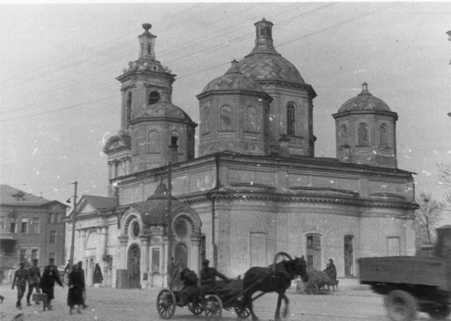 Фотография храма Спаса Преображения во время оккупации города Орла фашистами, 15 апреля 1942 года. В 1943 году перед отходом из города немцы минируют здание Преображенской церкви с архивными документами, но взрыв произведён не был. 3 апреля 1965 года Преображенская церковь была взорвана. Находился величественный храм на улице Московская дом 6. Фото 1 Фотография от ноября 1941 года в городе Орле, фашисты оккупировали область и город. Церкви на Московской улице. Фото 2 Советские военнопленные у здания вокзала города Орла, под конвоем фашистов, фотография октября 1941 года. Фото 3 Фотография здания на площади Мира дом 5, раньше это была улица Сталина, примерно осень 1941 или весна 1942 года. Один из воинов-освободителей, майор С. Трегуб, так рассказал о своих орловских впечатлениях: "Он лежал поверженный, растерзанный, растоптанный кованым немецким сапогом - древний русский город. Мы не узнали его улиц, его бульваров, его площадей. Всё было превращено в свалку: целые кварталы и целые у