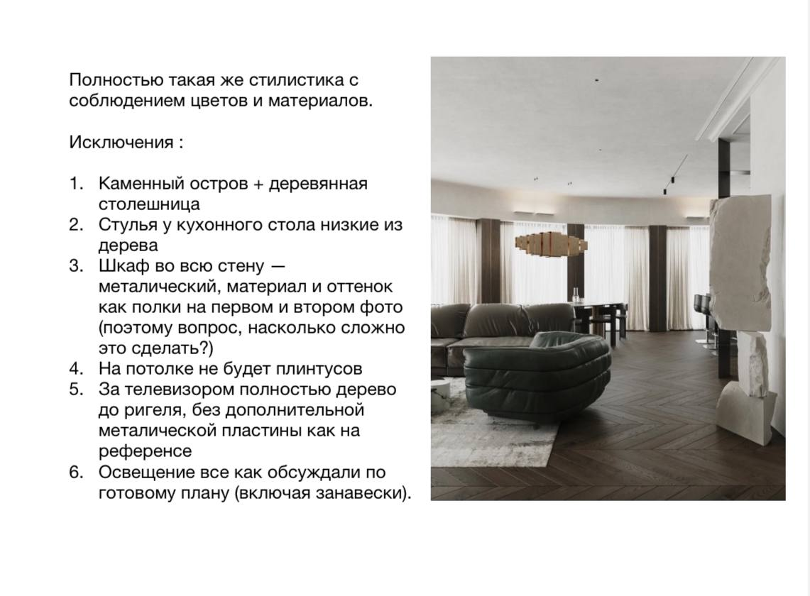 Понимание этих терминов помогает заказчику лучше ориентироваться в процессе ремонта, грамотно задавать вопросы и контролировать работу специалистов. Это экономит время, деньги и нервы. Первый шаг работы над проектом. Это документ, где заказчик описывает свои пожелания: стиль, количество комнат, потребности семьи, бюджет. На основе ТЗ дизайнер разрабатывает проект. Общее видение будущего пространства: стиль, настроение, цветовая палитра, ключевые материалы. Концепция формирует основу, вокруг которой строится весь проект. В карусели Вы можете увидеть реальный пример желаемой концепции интерьера от нашего заказчика. Предварительный вариант дизайн-проекта. Обычно включает планировки и 3D-визуализации, но без детальных чертежей и смет. Нужен для то